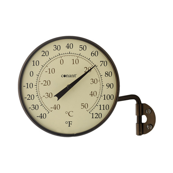 This thermometer’s accurate mechanism measures temperature in both Fahrenheit and Celsius. The convex glass crystal assures a clear, readable view of the classic numerals. The swivel arm completes the appearance and is easily mounted on a window, wall, or post.