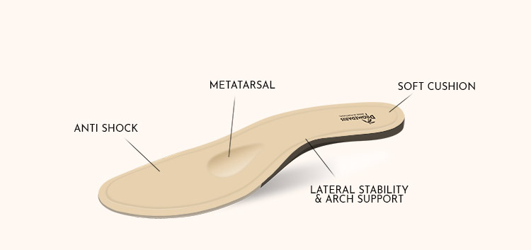 This high-density recovery foam never flattens. It is built for lateral stability, arch support, shock absorption and metatarsal insert with soft cushioning to relieve pressure on toes.