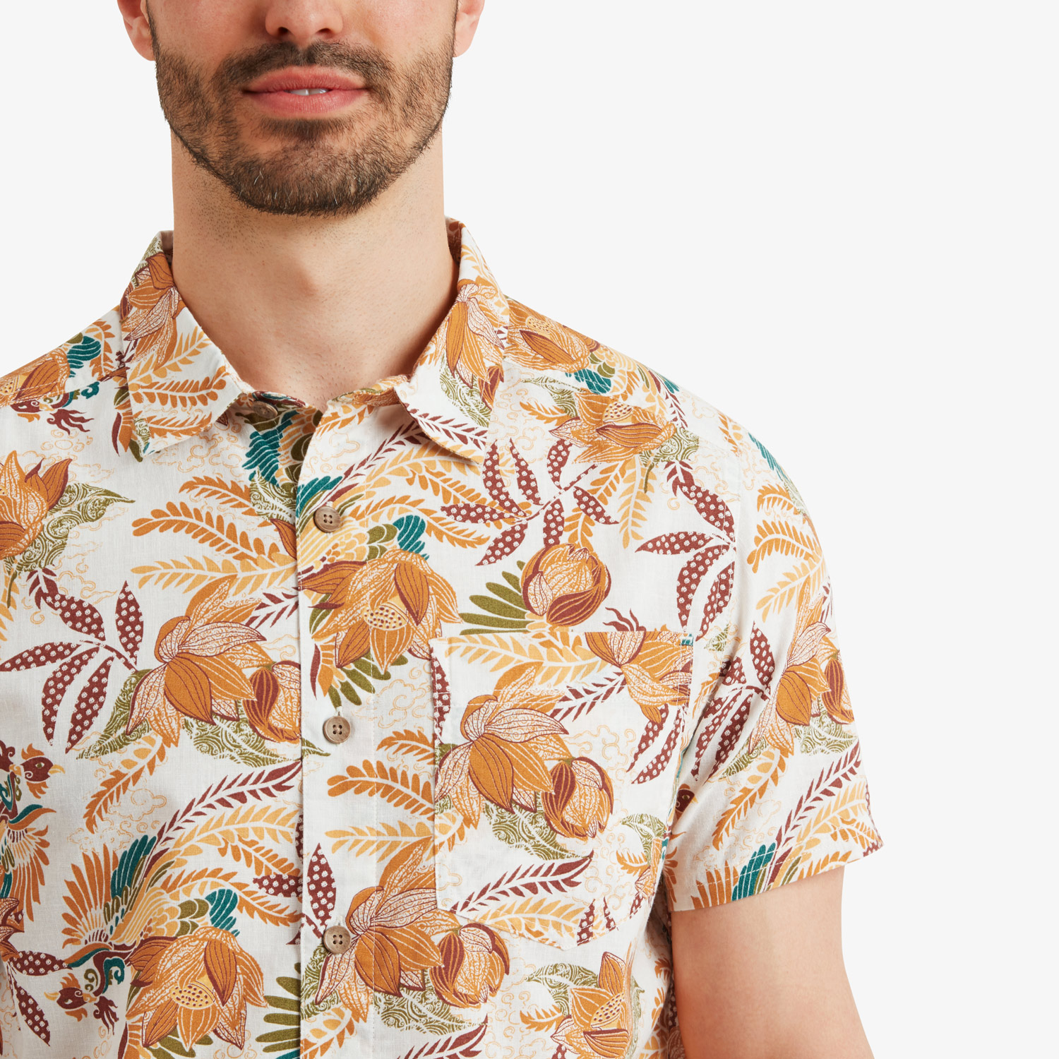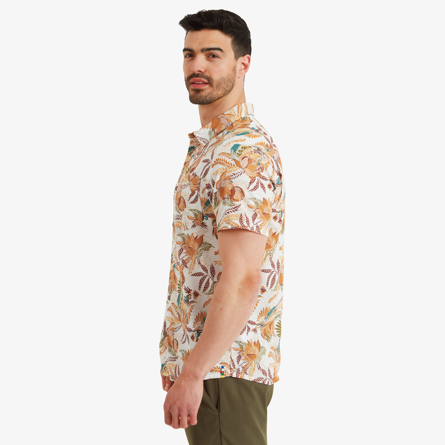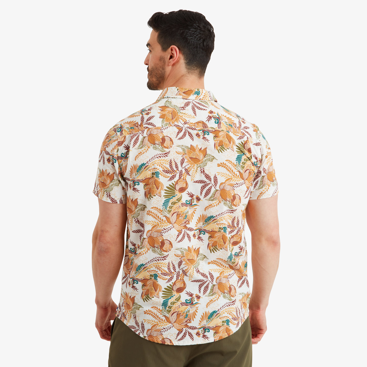 Like a phoenix from the ashes, the Phoenix Short Sleeve Shirt breathes new life into existing fabric. Repurposed, recycled cotton yarns blend with recycled polyester, creating a breathable, moisture wicking fabric. Cut with a trim fit, set-in sleeves, forward set shoulder seams, and a pleated back yoke, this shirt is ideally suited for smart-casual dressing. Displaying a striking floral print interspersed with the majestic phoenix, finished with faux wood buttons and our signature prayer flag tape at the back of the neck, the Phoenix Short Sleeve Shirt will take you effortlessly from day to night, and trail to town.